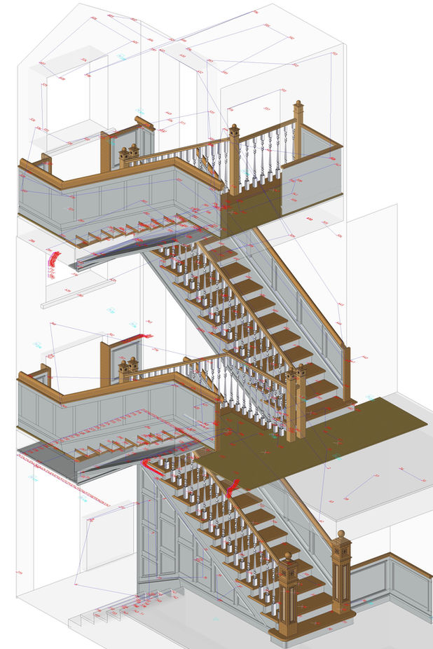 Zagotavljamo 3D izmere še tako velikih zgradb in prostorov kompleksnih oblik, vedno ob upoštevanju medprostorskih korelacij. Te so bistvenega pomena, ko notranja oprema prehaja med prostori. Na podlagi 3D izmer pripravimo 3D model ali 2D načrt.